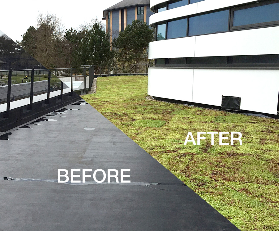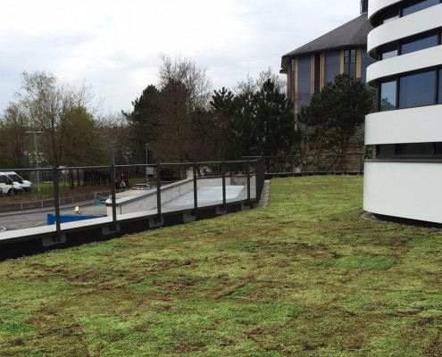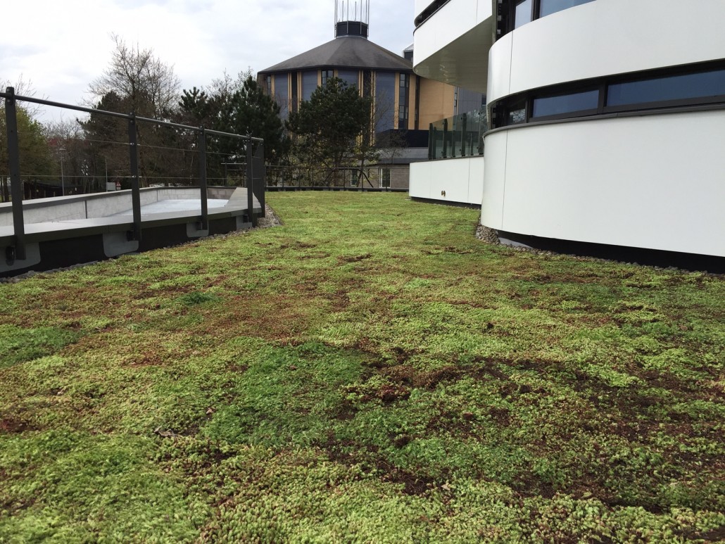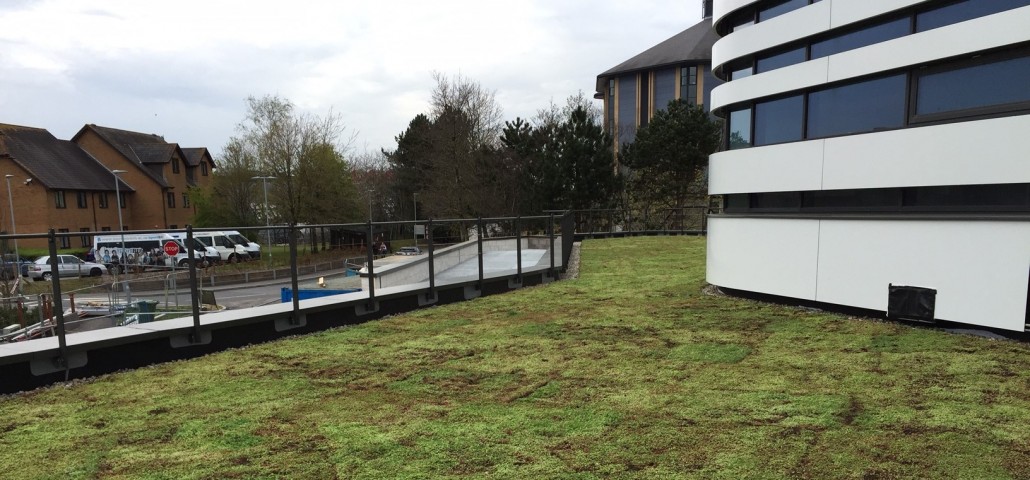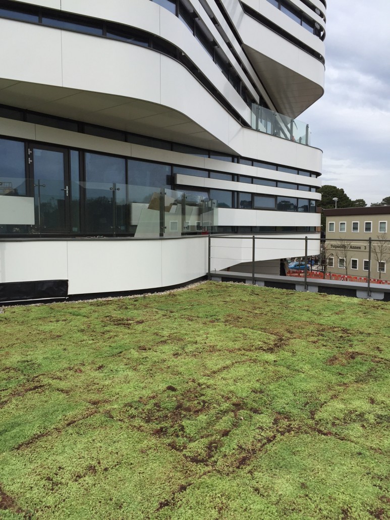 This 200 square metres of roof took less than a day to install with sedum blanket and river stone edging. The result looks stunning and works well with futuristic design of the building.